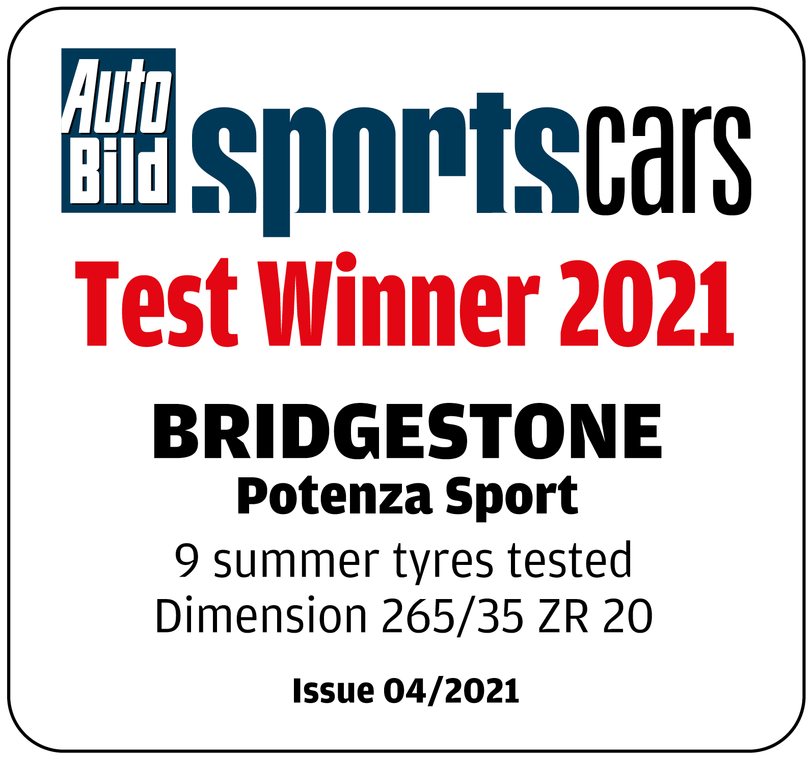 1 Tests carried out by TÜV SÜD on the request of Bridgestone in July-September 2020 at the facilities Bridgestone EUPG (Italy) for dry and wet tests with Audi S4 3.0 TFSI, on tyre size 245/40 R18. Potenza Sport compared to the performances